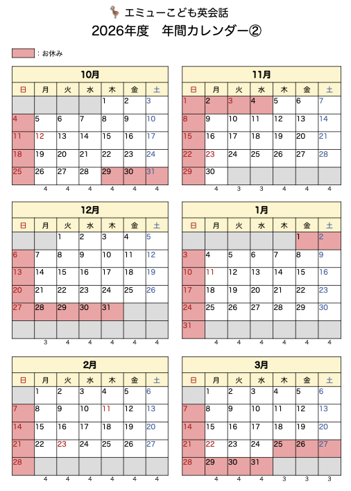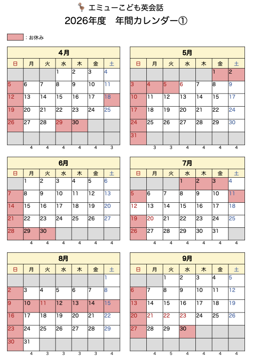 祝日はレッスンがあるけど、夏休みや年末年始のお休みがあるよ。年間カレンダーを確認してね。